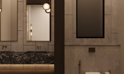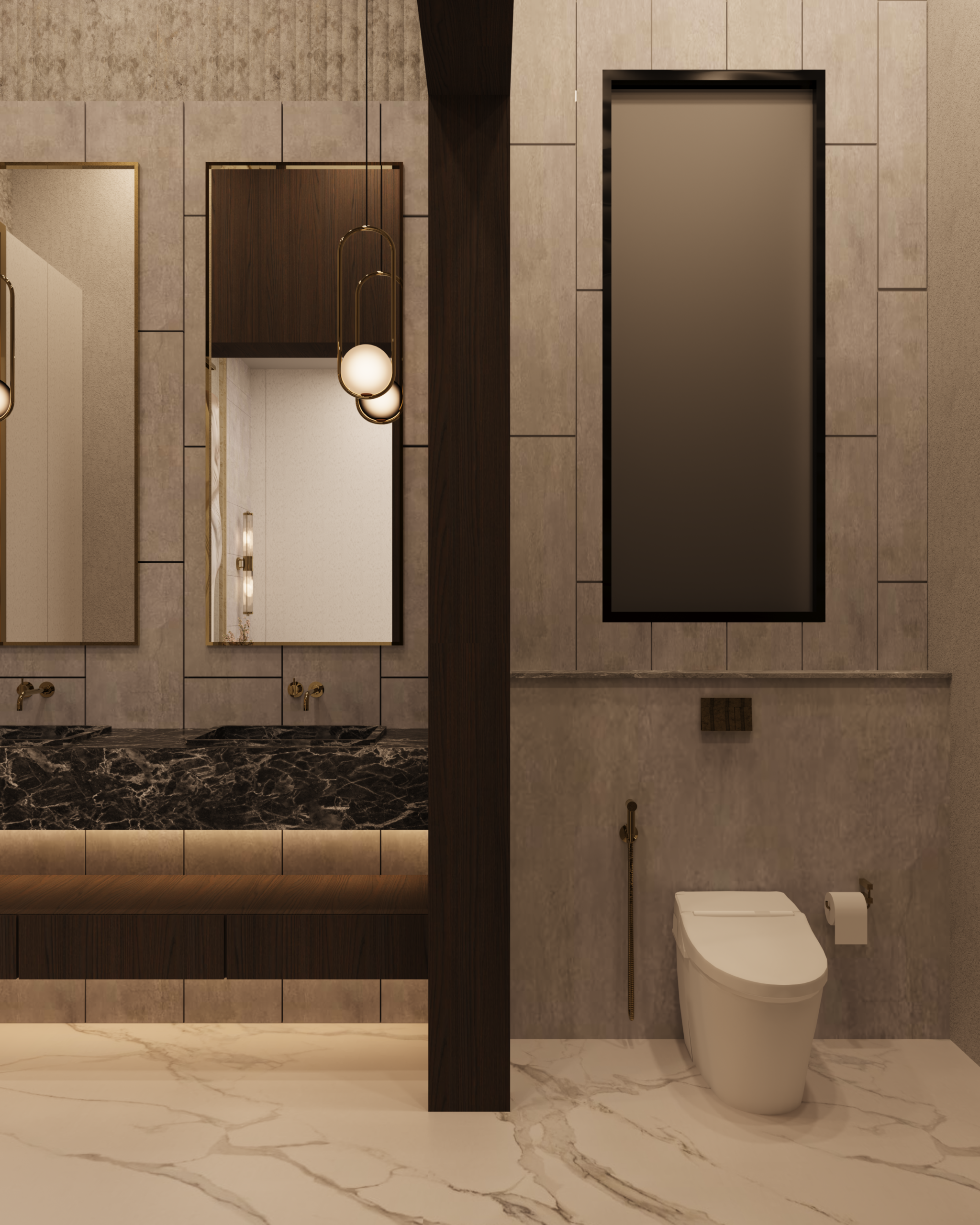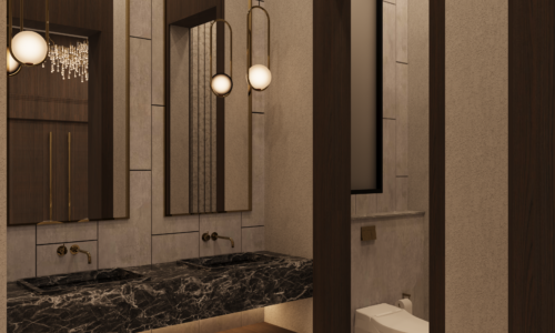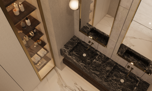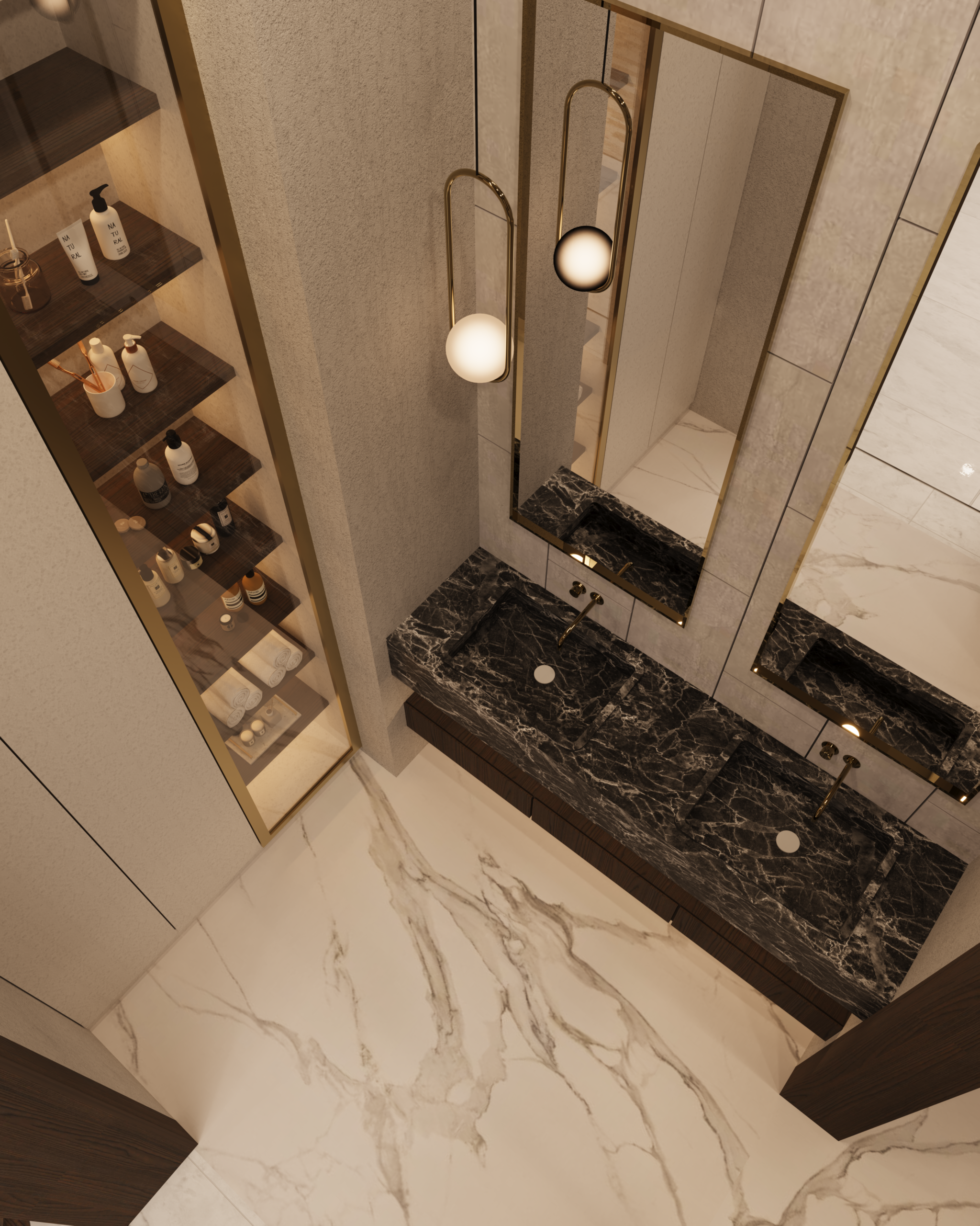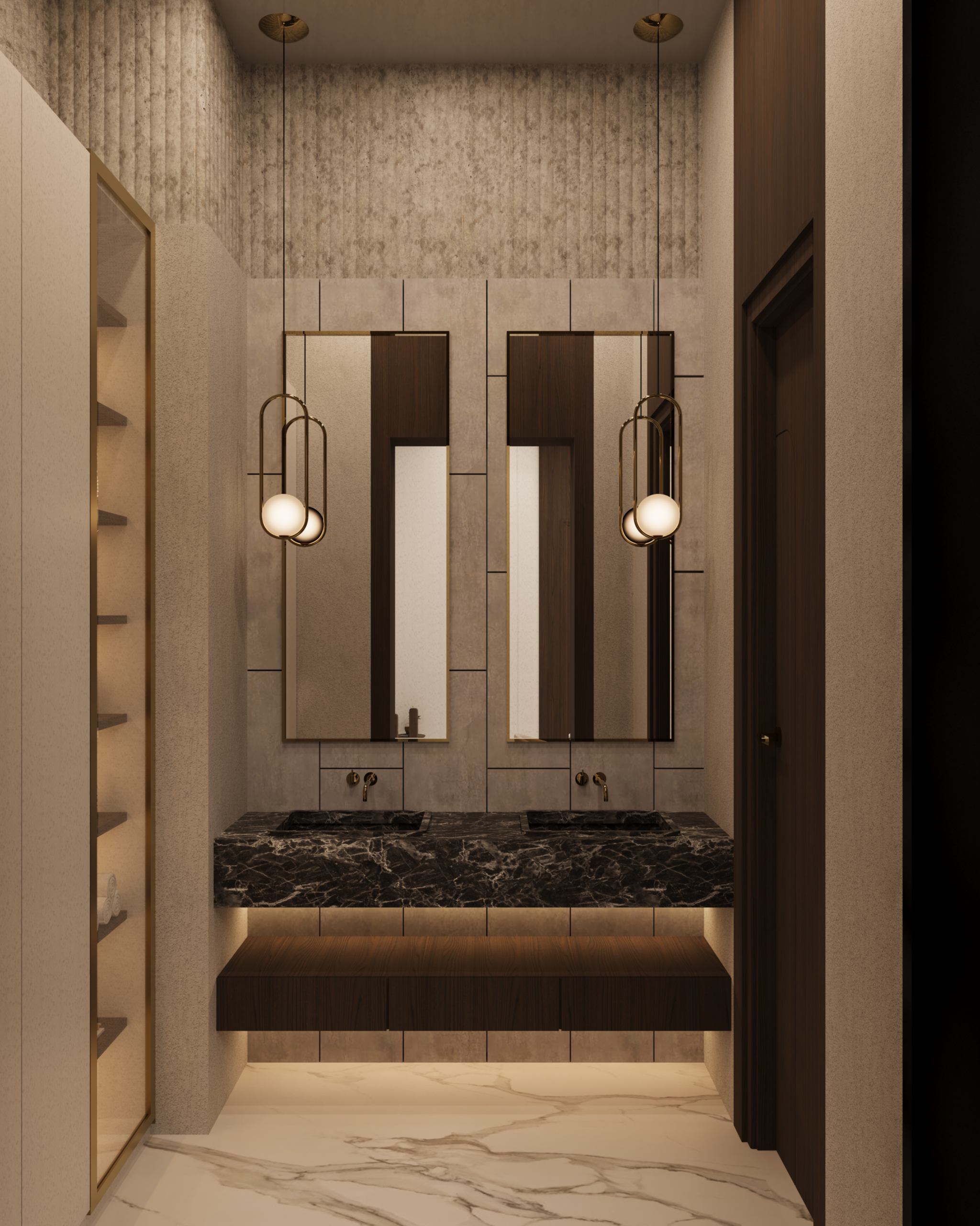 The powder room continues this quiet elegance with textured walls, dark marble basins and flattering soft lighting. Every feature, from floating vanities to integrated shelving, is tailored and intentional.
