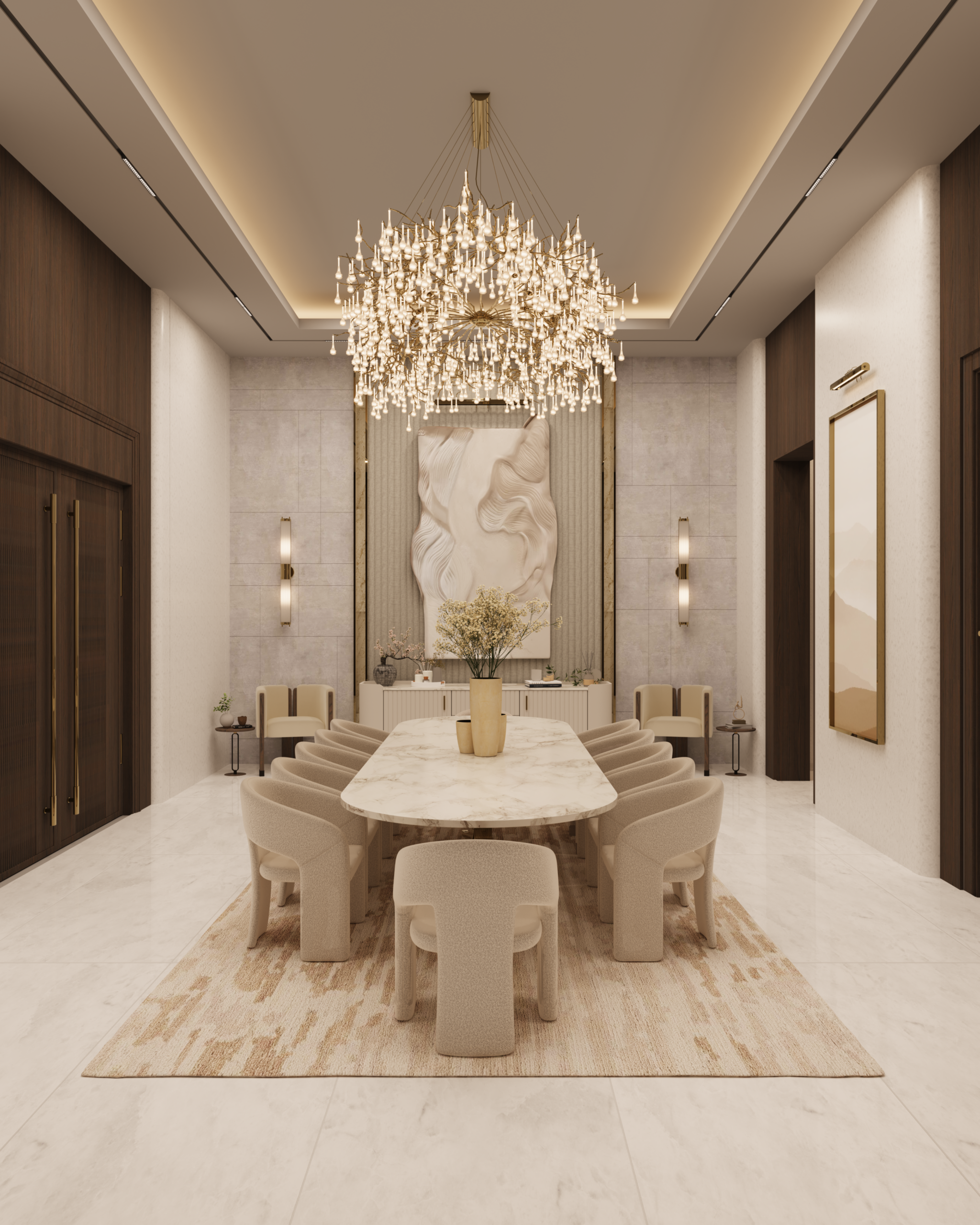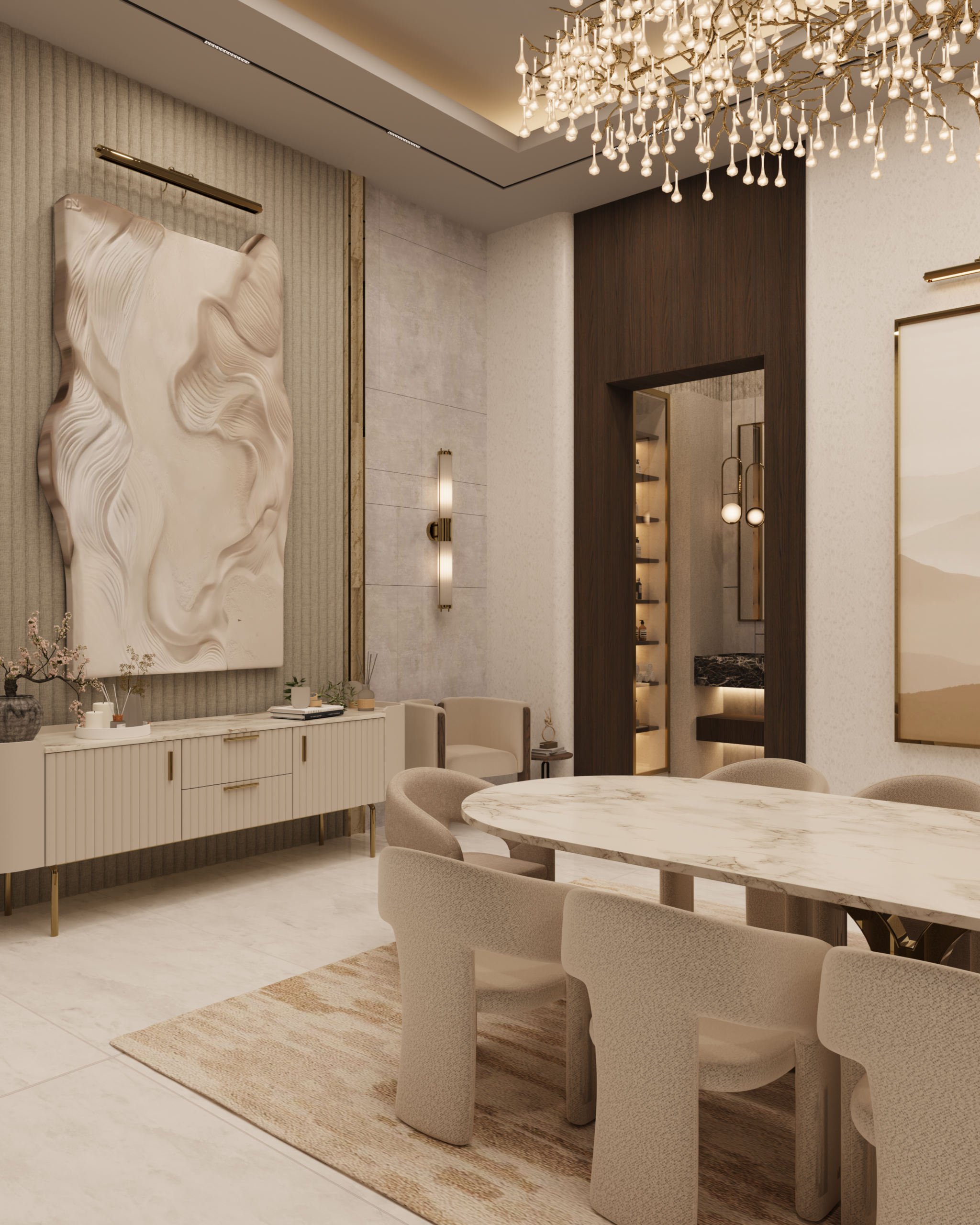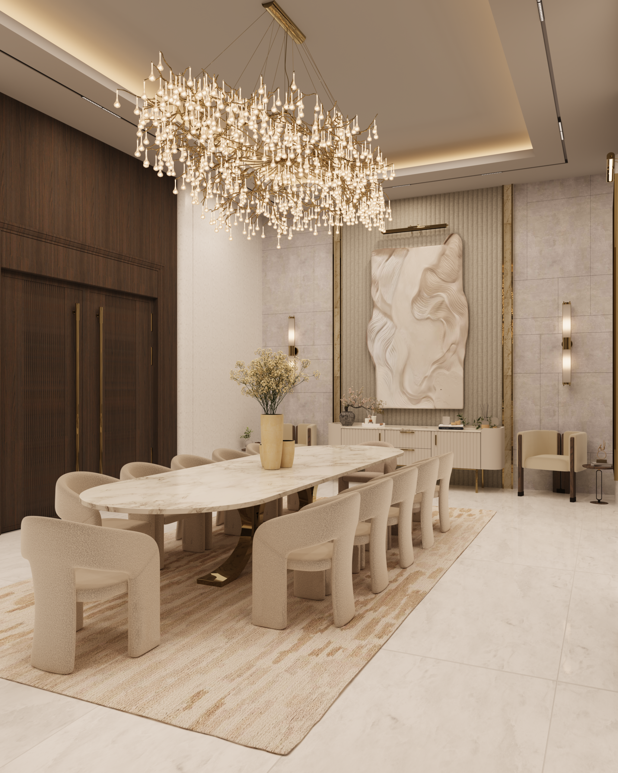 The dining suite is built around proportion, symmetry and softness. A sculptural chandelier anchors the space, casting a warm glow over a marble-topped table designed for long gatherings. The palette—creams, warm woods and brushed gold—creates understated luxury.