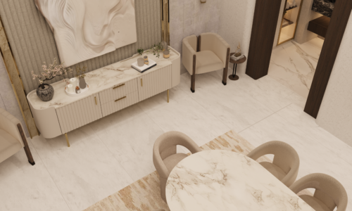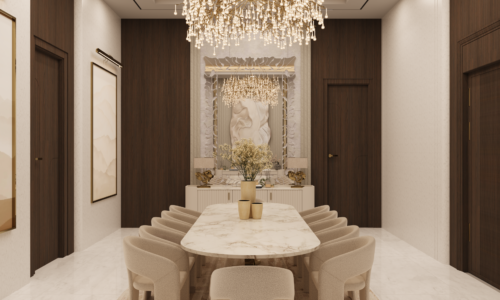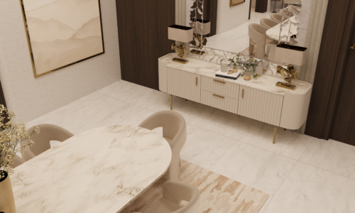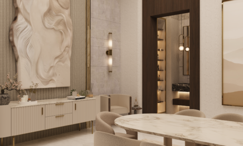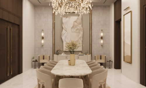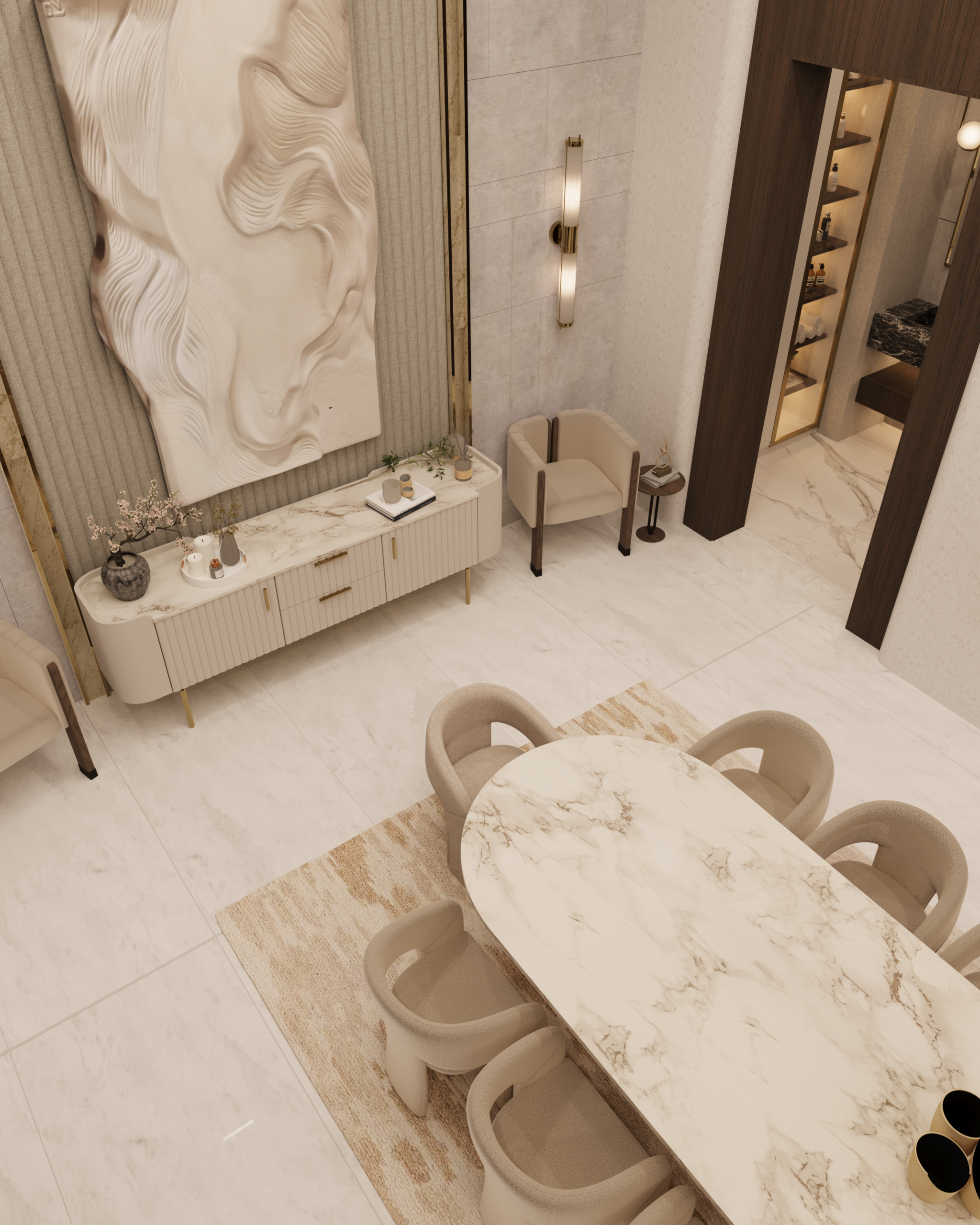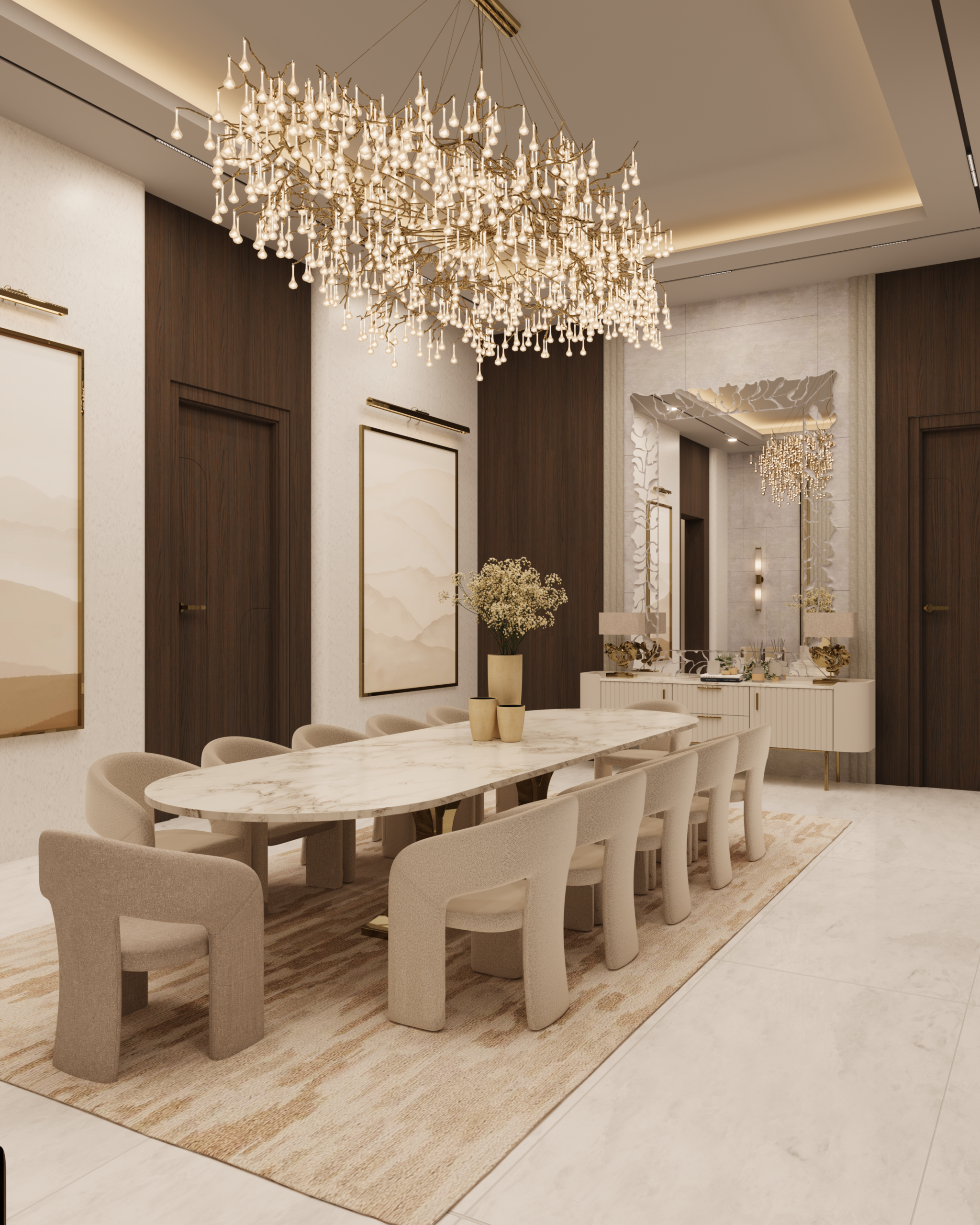 The dining suite is built around proportion, symmetry and softness. A sculptural chandelier anchors the space, casting a warm glow over a marble-topped table designed for long gatherings. The palette—creams, warm woods and brushed gold—creates understated luxury.